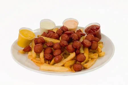 Salchipapas trozos de salchicha con patatas fritas y 3 salsas 5,00€ Patatas 3 salsas (ración) 4,40€